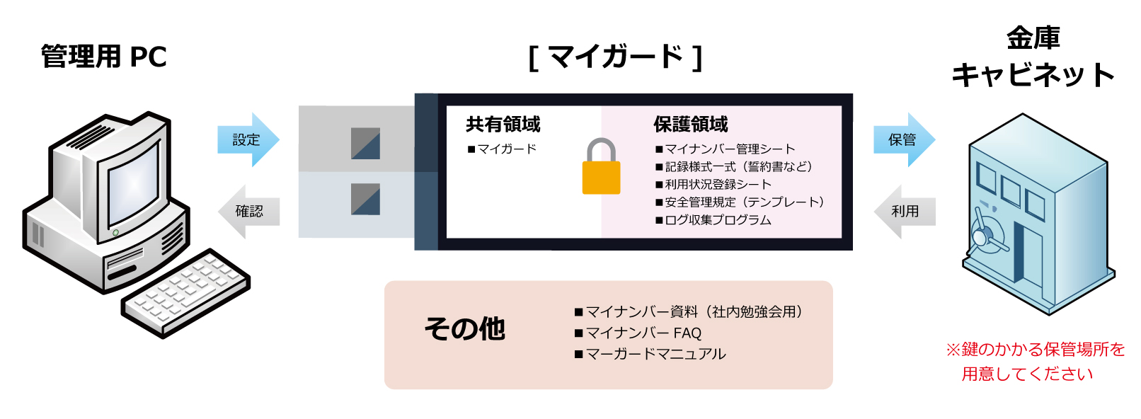 「マイガード」は、マイナンバーをクラウド上や企業内のネットワーク上において管理するのではなく、パソコン用のUSBメモリー内に保護領域を設けて、パスワードによって安全に保護管理します。マイナンバーを格納したUSBメモリーはパソコンから取り外し、企業内の金庫や鍵のついたキャビネットなどにおいて保管していただくため、万一、企業内のネットワークが外部から不正にアクセスされた場合でも、安全に保護することができます。